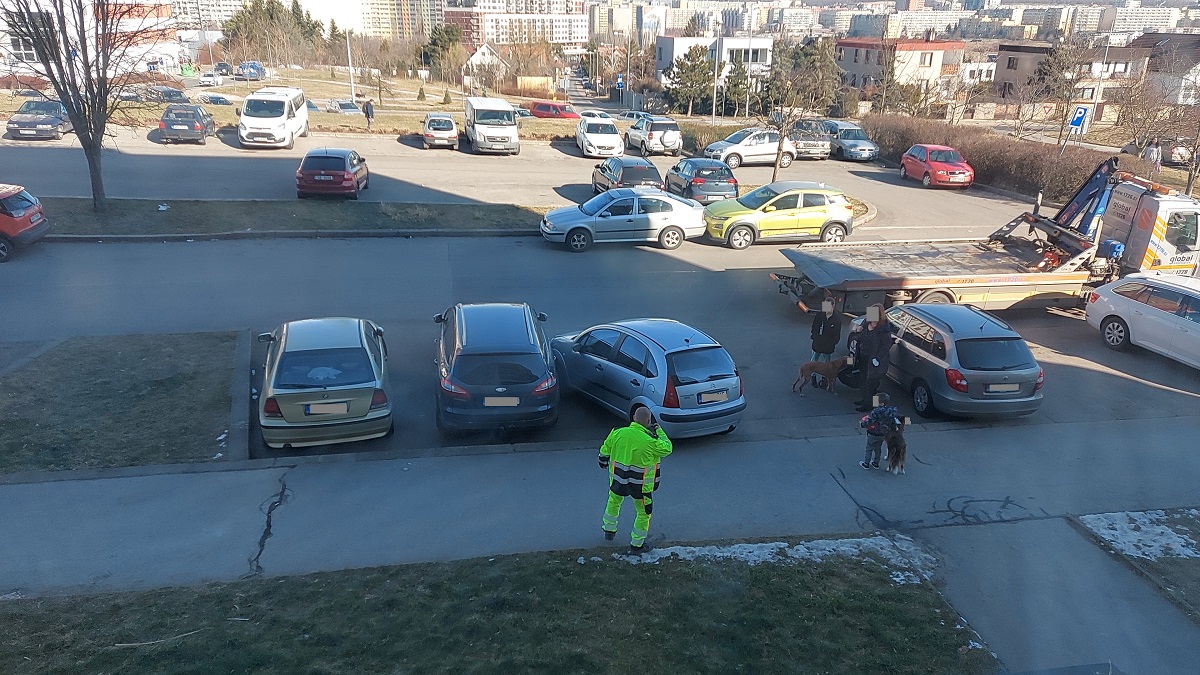 Pod oknem jsem viděl vyprošťování havarovanéo auta a lámu si hlavu, jak se to té paní podařilo. Levý přední nárazník nabořila do dveří spolujezdce zaparkovaného auta, přičemž sama měla levé zadní kolo na chodníku. Při odtahu bylo vidět, že její auto má zničený i pravý přední nárazník.
